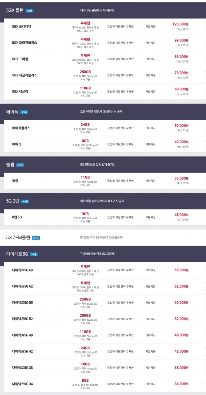 월 6만9000원에 무제한 데이터를 제공하는 '다이렉트5G 69'까지 추가되며 4종이었던 5G 요금제는 7종이 됐다.