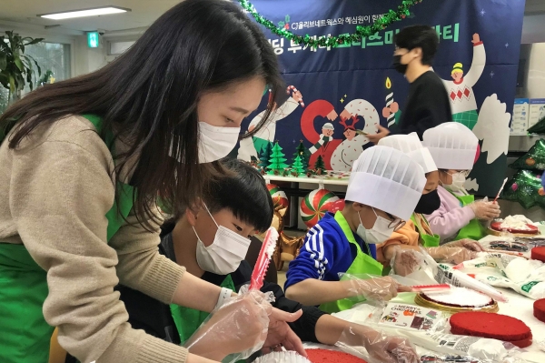 ▲ CJ올리브네트웍스 임직원이 결연 사회복지기관에서 아이들과 함께 크리스마스 케이크를 만들고 있다. [CJ올리브네트웍스 제공]