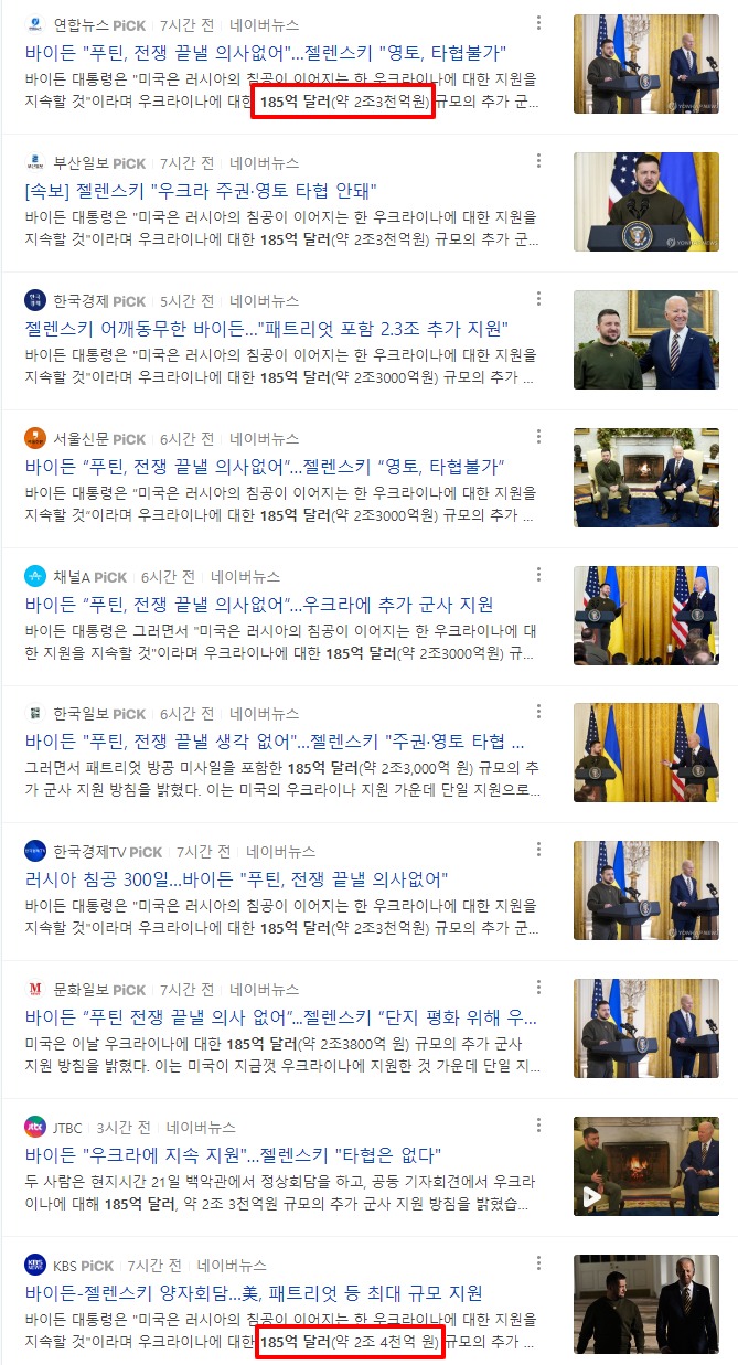 그런데 1보를 날린 KBS와 연합뉴스가 "우크라이나에 대한 185억 달러(약 2조4000억 원) 규모의 추가 군사 지원 방침을 밝혔다"(KBS)거나 "우크라이나에 대한 185억 달러(약 2조3000억 원) 규모의 추가 군사 지원 방침을 밝혔다"(연합)고 수치를 잘못 옮겨 보도한 것이 '줄줄이 오보'를 양산했다.