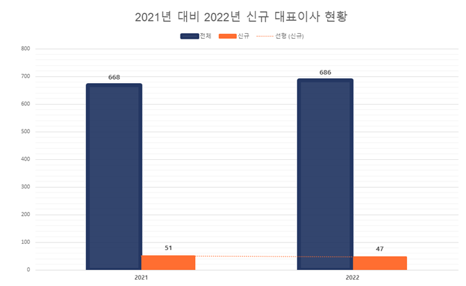 기업분석연구소 리더스인덱스(대표 박주근)가 매출 상위 500대 기업 CEO 현황을 분석, 27일 발표한 바에 따르면 올해 10월 이후 새로 임명된 신임 CEO들은 47명으로 전체 686명의 대표 중 6.9%인 것으로 나타났다. 지난 해 같은 기간 51명이 새로 임명된 것보다 소폭 감소했다.