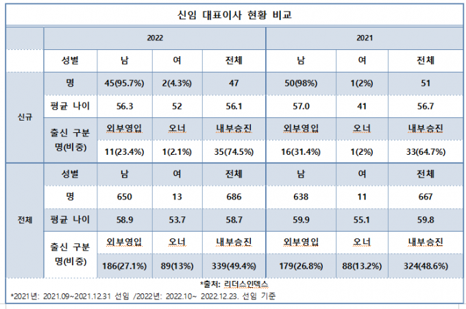 외부영입 비중은 31.4%에서 23.4%로 감소했다. 내부 출신 CEO는 64.7%에서 74.5%로 비중이 증가했다.