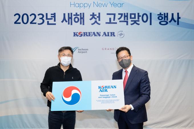 ▲ 대한항공의 새해 첫 승객 유병호(왼쪽) 씨가 송보영 대한항공 여객사업본부장과 기념촬영하고 있다. [대한항공 제공]
