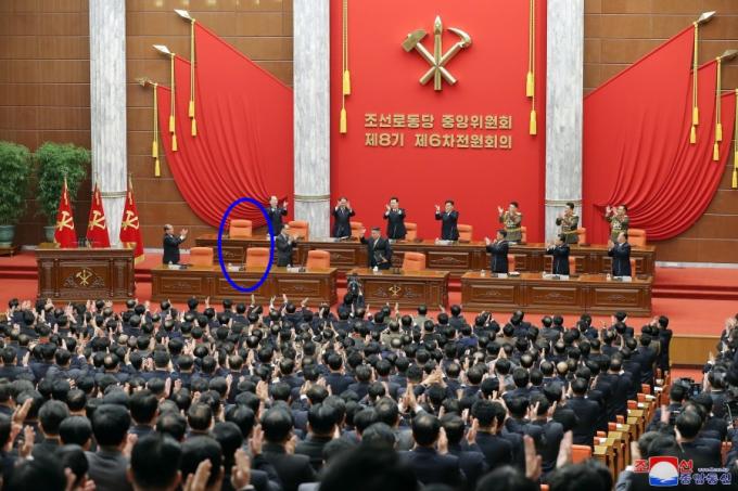 한편 후열(두 번째 줄)의 왼쪽 끝자리 좌석은 전원회의 내내 빈자리였다. 다른 좌석의 책상에 놓인 명패와 물잔도 이 자리에는 없었다. 자리는 있지만 비워놓은 '공석'인 것이다.