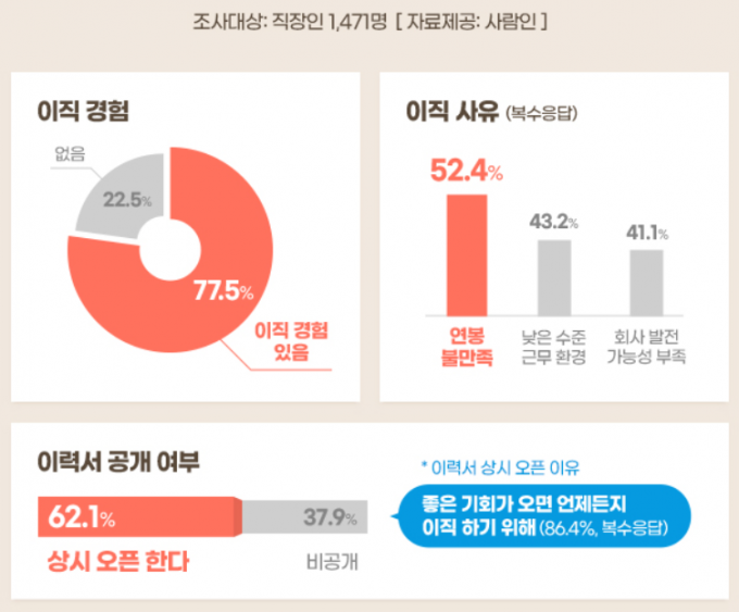 설문조사에서도 응답자의 62.1%가 '당장 이직 계획이 없어도 이력서를 상시 오픈한다'고 했다. '당장은 아니어도 좋은 기회가 오면 언제든 이직하기 위해'(86.4%, 복수응답)서다.