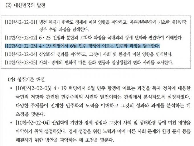 ▲ 2022년 12월 교육부가 확정해 고시한 '2022 개정 고등학교 교육과정' 중 사회과 공통과목 '한국사2' 일부. '5·18 민주화운동' 표현이 빠져 있다. [뉴시스]