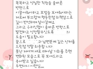 뒤늦게 상황의 심각성을 안 B 씨는 다른 직원들을 통해 A 씨와 접촉을 시도했다. 그러나 접촉을 거부당하자 B 씨는 결국 크리스마스날인 지난달 25일 자신의 아내와 함께 A 씨의 자택을 찾아가 무릎을 꿇고 사과했다고 한다.