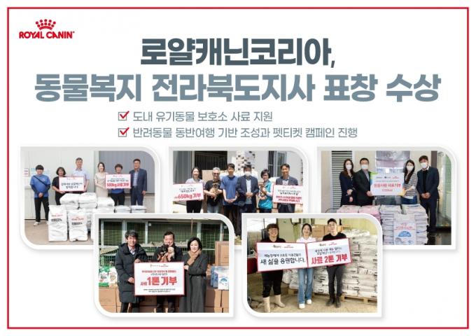 로얄캐닌코리아는 전북 지역의 유기동물 보호소에 사료를 지원하고 반려견 동반 여행 기반을 조성하는 등 동물복지 향상을 위한 노력을 인정받아 도지사 표창을 받았다.
