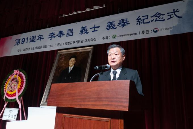 ▲ 정수용 이봉창의사기념사업회 회장이 지난 8일 서울 용산구 백범김구기념관에서 열린 제91주년 이봉창 의사 의거 기념식에서 기념사를 하고 있다. [빙그레 제공]