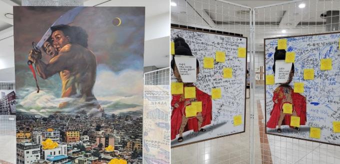 이들은 전시회 철회에 강력 반발했다. 국민의힘은 그림 내용을 문제삼아 야당 의원을 맹비난했다.