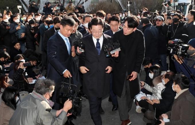 이 대표는 정문 앞 도로가에 차량을 세우고 내린 뒤 자신의 이름을 부르며 응원하는 지지자들과 악수하며 성남지청 청사 앞 포토라인까지 도보로 이동했다.