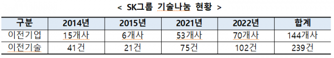 SK는 SK하이닉스를 시작으로 2014년부터 기술나눔에 참여해왔다. 이번 행사까지 총 144개 기업에 239건의 기술을 이전했다.