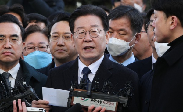 이 대표는 이날 오전 10시 35분쯤 취재진이 만들어 둔 포토라인에서 걸음을 멈췄다. 그의 뒤에는 동행한 민주당 지도부와 친명계 등 의원 50여명이 '병풍'처럼 섰다. 곳곳에서 고성이 나와 이 대표는 10초가량 아무 말 없이 듣고 서 있었다.