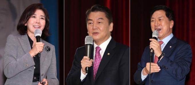 ▲ 국민의힘 나경원 전 의원(왼쪽 사진부터)과 안철수, 김기현 의원이 지난해 10월 28일 경기 고양시 덕양구청에서 열린 당원협의회 당원연수에서 강연하고 있다. [뉴시스]