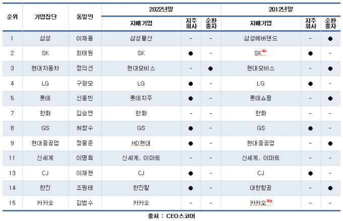 ▲ 최근 10년간 상위 30대 그룹 지배구조 변화 [CEO스코어 발표 캡처]