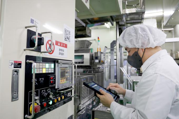 ▲ 안전 관리자가 SPC삼립 시화공장에서 'SPC 통합 안전점검 앱'을 활용해 설비 안전점검을 진행하고 있다. [SPC 제공]