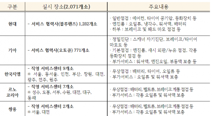 무상점검 내용은 엔진·에어컨 상태, 타이어 공기압 및 마모상태, 브레이크 및 패드 마모도 점검, 냉각수 및 각종 오일류, 와이퍼, 휴즈 상태 점검 등이다.