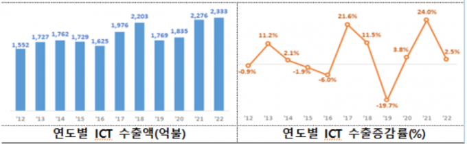 어려운 경제 여건 속에서도 2022년 정보통신기술(ICT) 수출액이 역대 최대를 기록했다.