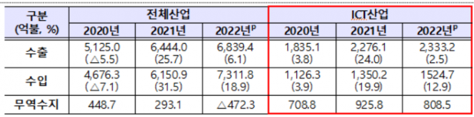 러·우 전쟁 장기화와 세계경기 둔화 등으로 전체 수출은 적자였지만 ICT는 808억5000억달러의 흑자도 거뒀다.