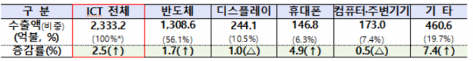 12일 산업통상자원부와 과학기술정보통신부 발표에 따르면 지난해 ICT 수출액은 전년 대비 2.5% 증가한 2333억2000만 달러를 기록했다.