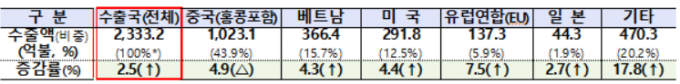 국가별로는 중국을 제외한 베트남(4.3%)과 미국(4.4%), 유럽연합(EU, 7.5%), 일본(2.7%)에서 수출액이 증가했다.