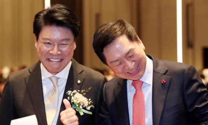 ▲ 국민의힘 장제원(왼쪽), 김기현 의원이 지난해 12월 26일 부산 롯데호텔에서 열린 부산혁신포럼 2기 출범식에 참석해 웃으며 대화하고 있다. [뉴시스]