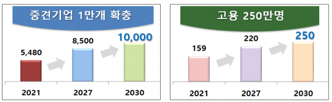 2027년까지 1조원 규모의 '중견기업 도약 지원 펀드'도 조성, 중견기업이 신사업·신기술을 확보하는데 필요한 투자 자금을 지원할 계획이다.