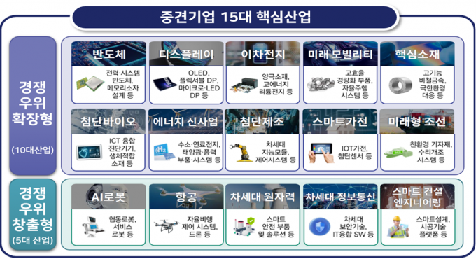 정부는 이날 '중견기업 성장촉진 전략'을 발표하고 '15대 핵심산업'을 중심으로 글로벌 진출과 공급망 안정, 디지털전환에 향후 10년간 연구개발(R&D)비로 1조5000억 원을 투입하기로 했다.