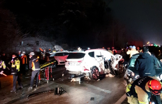 경찰과 소방당국은 대설주의보가 발령된 가운데 이날 오전에 내린 눈이 녹으면서 생긴 물이 밤이 되면서 도로에 쌓여있던 매연과 섞여 얼어붙어 눈에 잘 띄지 않는 '블랙아이스' 형태의 얇은 빙판이 형성돼 있었던 것으로 보고 사고원인을 조사하고 있다.