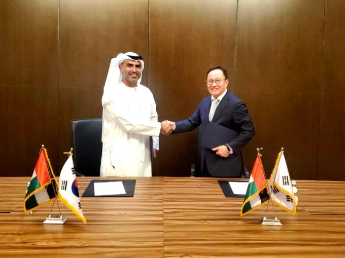 ▲ 두바이사이언스파크 마르완 압둘아지즈 자나히 대표(왼쪽)와 메디톡스 정현호 대표(오른쪽)가 16일(현지시간) 아랍에미리트(UAE) 아부다비에 위치한 릭소스 마리나 호텔에서 '톡신 완제품 공장 건립 양해각서(MOU)'를 체결한 후 기념 촬영을 하고 있다. [메디톡스 제공]