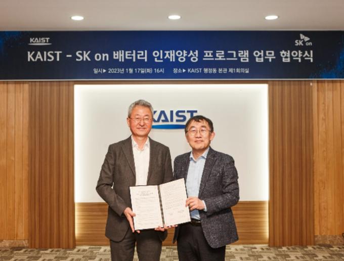 SK온은 대전시 KAIST에서 이승섭 KAIST 부총장, SK온 진교원 사장(최고운영자, COO)이 참석한 가운데 'SKBEP(SK on-KAIST Battery Educational Program)' 개설 업무협약식을 가졌다고 18일 밝혔다.
