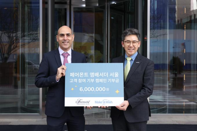 후원금 전달식은 지난 19일 서울 여의도에 위치한 페어몬트 앰배서더 서울 호텔에서 진행됐다. 이 전달식엔 프랭크 로아송 페어몬트 앰배서더 서울 호텔 총지배인과 김경욱 메이크어위시 코리아 재단 사무총장이 참석했다.