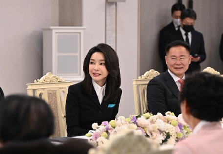 윤 대통령 결혼 에피소드 소개하는 등 시종 화기애애 윤석열 대통령 부인 김건희 여사가 27일 서울 한남동 관저에서 국민의힘 여성 의원 10명과 오찬을 가졌다.