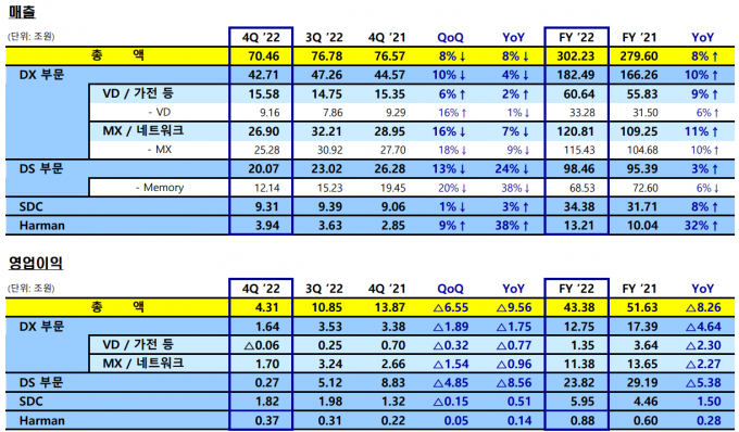 반도체 부문의 부진으로 삼성전자 전체 4분기 영업이익 역시 8년만에 4조원대로 주저앉았다. 4조3100억 원을 기록하며 2021년 4분기 대비 68.9% 감소했다.
