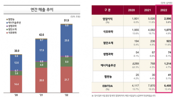 신규 사업 확장 위해 4조 원 규모 시설 투자 LG화학이 배터리 등 신사업의 성장세 덕에 창사 이래 처음으로 연간 매출 50조 원을 돌파했다. 지난해 연결기준 매출 51조8649억 원, 영업이익 2조9957억 원의 경영실적을 달성했다.