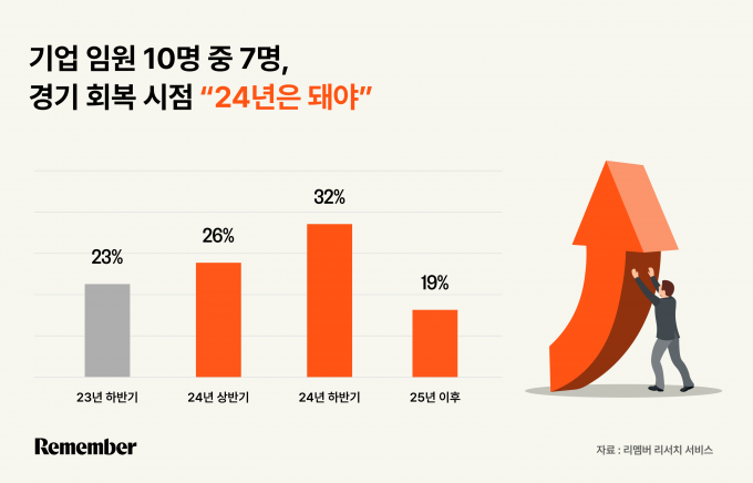 기업 임원들이 예상하는 경기 회복 시기는 2024년 이후였다. 응답자의 76%가 경기 회복 예상 시점을 '24년 이후'로 전망했다. '24년 하반기'(32%)라고 답한 응답자가 가장 많았고 그 다음이 '24년 상반기'(26%)였다.