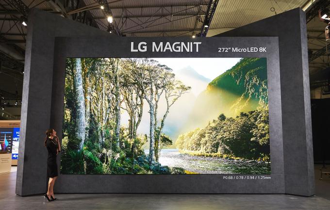LG전자는 전시관 입구에 8K(7680×4320) 해상도의 272형(대각선 길이 약 6.9미터) 마이크로 LED 사이니지 'LG 매그니트(MAGNIT)'로 관람객들의 이목을 사로잡는다는 전략.