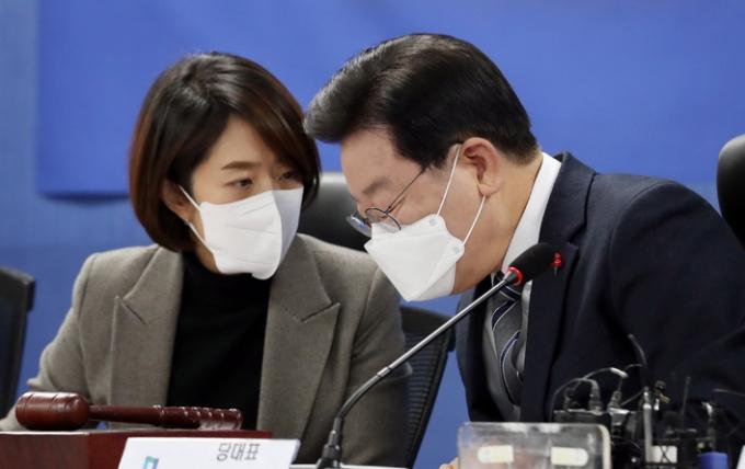▲ 더불어민주당 이재명 대표(오른쪽)가 지난달 6일 국회 의원회관에서 열린 확대간부회의에서 고민정 최고위원의 말을 듣고 있다. [뉴시스]