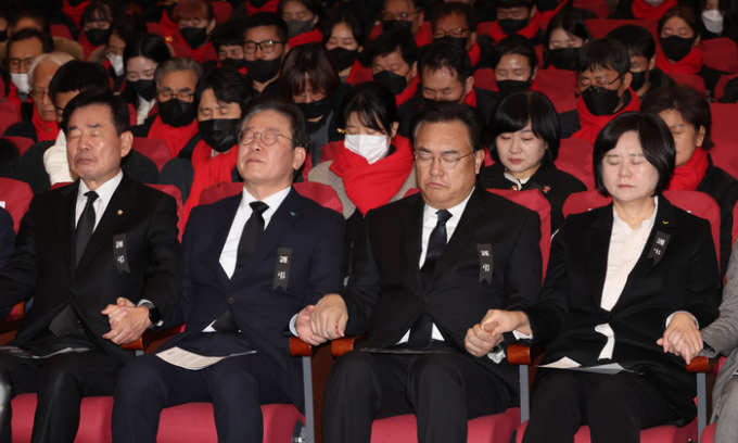 ▲ 김진표(왼쪽부터) 국회의장, 이재명 더불어민주당 대표, 정진석 국민의힘 비상대책위원장, 이정미 정의당 대표가 5일 오전 서울 여의도 국회 의원회관 대회의실에서 열린 10.29 이태원 참사 국회추모제에서 기독교 추모의례에 맞춰 손을 잡고 기도하고 있다. [뉴시스]