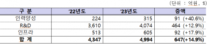 특히 연구개발(R&D) 등 인력의 질을 고도화하고 관련 생태계 활성화를 위해 인재 양성 315억 원을 포함, 관련예산 규모도 올해 4994억 원으로 확대했다. 지난해 4347억 원에서 647억 원을 증액했다.