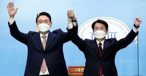 ▲ 윤석열 대통령과 국민의힘 안철수 당대표 후보가 지난해 3월 3일 대선 후보 단일화를 선언한 뒤 사진 촬영을 하고 있다. [뉴시스]