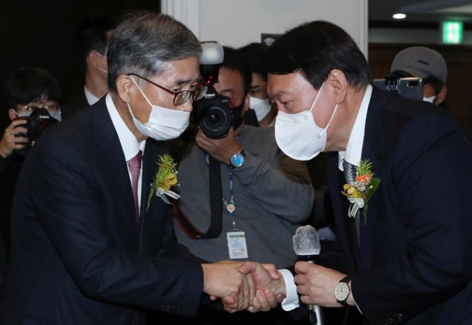 ▲ 윤석열 대통령이 국민의힘 대선 후보 시절인 2021년 11월  9일 서울 중구 프레스센터에서 열린 신평 변호사 출판기념회에서 신 변호사와 만나 악수하고 있다. [뉴시스]