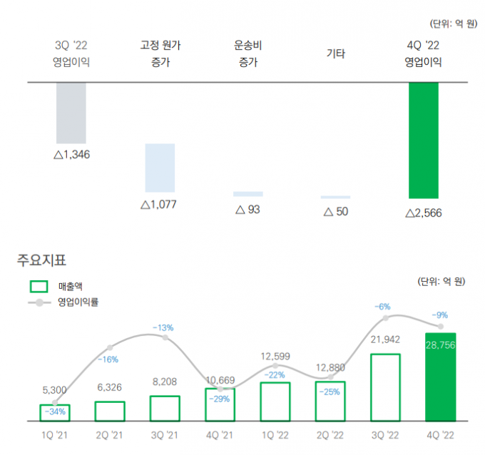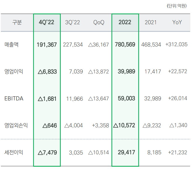 4분기 매출은 19조1367억 원, 영업손실 6833억 원을 기록했다. 전분기 대비 매출은 3조6167억 원 줄었고 영업이익은 적자로 전환했다. 전년 같은 기간보다 매출이 5조4150억 원 늘었지만 영업손실도 6210억 원 확대됐다.