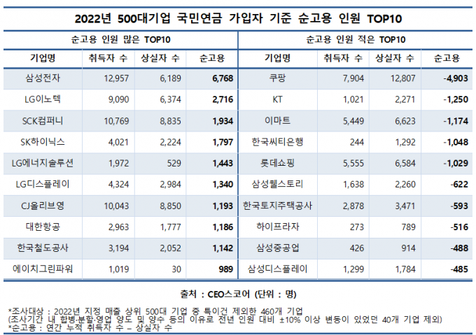 이외에 SCK컴퍼니(옛 스타벅스커피코리아, 1934명), SK하이닉스(1797명), LG에너지솔루션(1443명), LG디스플레이(1340명), CJ올리브영(1193명), 대한항공(1186명) 등도 순고용이 늘었다.