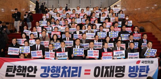 국민의힘 의원들은 탄핵소추안 가결 직후 본회의장을 나와 로텐더홀 계단에서 '탄핵소추안 강행처리 규탄대회'를 열고 비판의 목소리를 높였다.