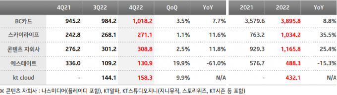 금융사업에서는 BC카드가 신용카드 매입액 증가, 자체카드 발행사업 확대, 스마트로 자회사 편입에 따른 실적 반영으로 매출이 8.8% 상승했다.