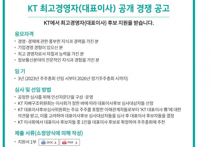 KT는 10일 홈페이지를 통해 2023년 정기 주총부터 2026년 정기 주총까지 3년 간 KT를 이끌 대표이사를 모집한다는 내용으로 후보 모집 공지를 올렸다.