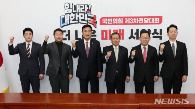▲국민의힘 정진석 비상대책위원장, 주호영 원내대표와 청년최고위원 후보들이 10일 오후 국회에서 열린 '힘내라 대한민국! 제3차 전당대회 더 나은 미래 서약식'에서 주먹을 불끈 쥔 채 기념촬영하고 있다. 왼쪽부터 김정식, 장예찬 후보, 정 위원장, 유흥수 전당대회 선거관리위원장, 주 원내대표, 이기인 후보.  [뉴시스]