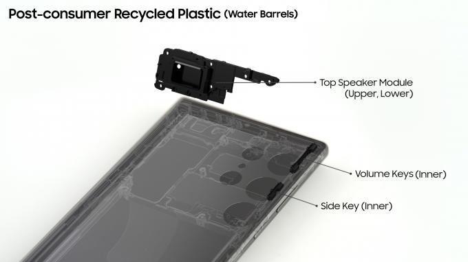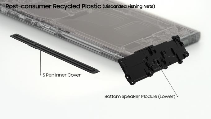 폐어망 재활용 소재를 20% 사용해 만든 재활용 플라스틱(PA: Polyamide)은 내부 S펜 커버, 하단 스피커 모듈 등에 활용됐다.