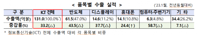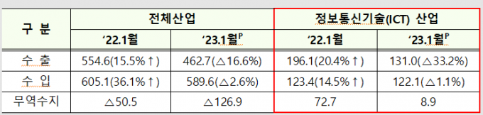 산업통상자원부가 14일 발표한 '정보통신기술 수출입 동향'에 따르면 지난 1월 ICT 수출액은 131.0억 달러로 2022년 1월 196.1억 달러보다 33.2% 줄었다. 수입액은 122.1억 달러로 전년 동월 대비 1.1% 감소했다.
