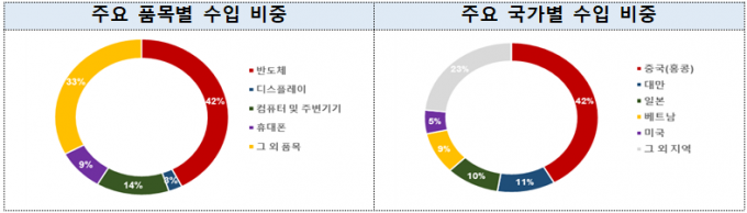 휴대폰은 수입액도 10.6억 달러로 전년 동월보다 70.1% 증가했다. 반도체 수입액은 51.7억 달러로 10.5% 감소했고 컴퓨터· 주변기기는 16.6억 달러(△13.6%), 디스플레이 3.1억 달러(△28.2%)였다.